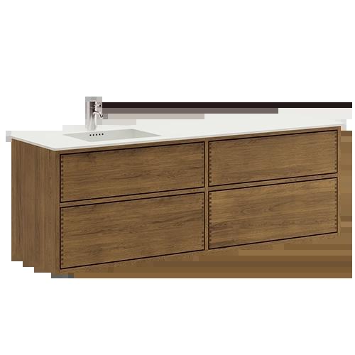 Dette snedker badmøbel har 4 skuffer med push to open og vasken er placeret i venstre side. Badmøblet er fremstillet med massive, olierede og fingertappede træskuffer i egetræ med flotte detaljer. Skufferne åbnes ved at trykke på skuffen, hvorefter de skubbes ud af møblet. Skufferne lukkes ved at skubbe dem tilbage i møblet, hvor de med et 'klik' glider på plads. Kommer med vaskeudskæring i øverste skuffe og fuld dybde i den nederste skuffe.