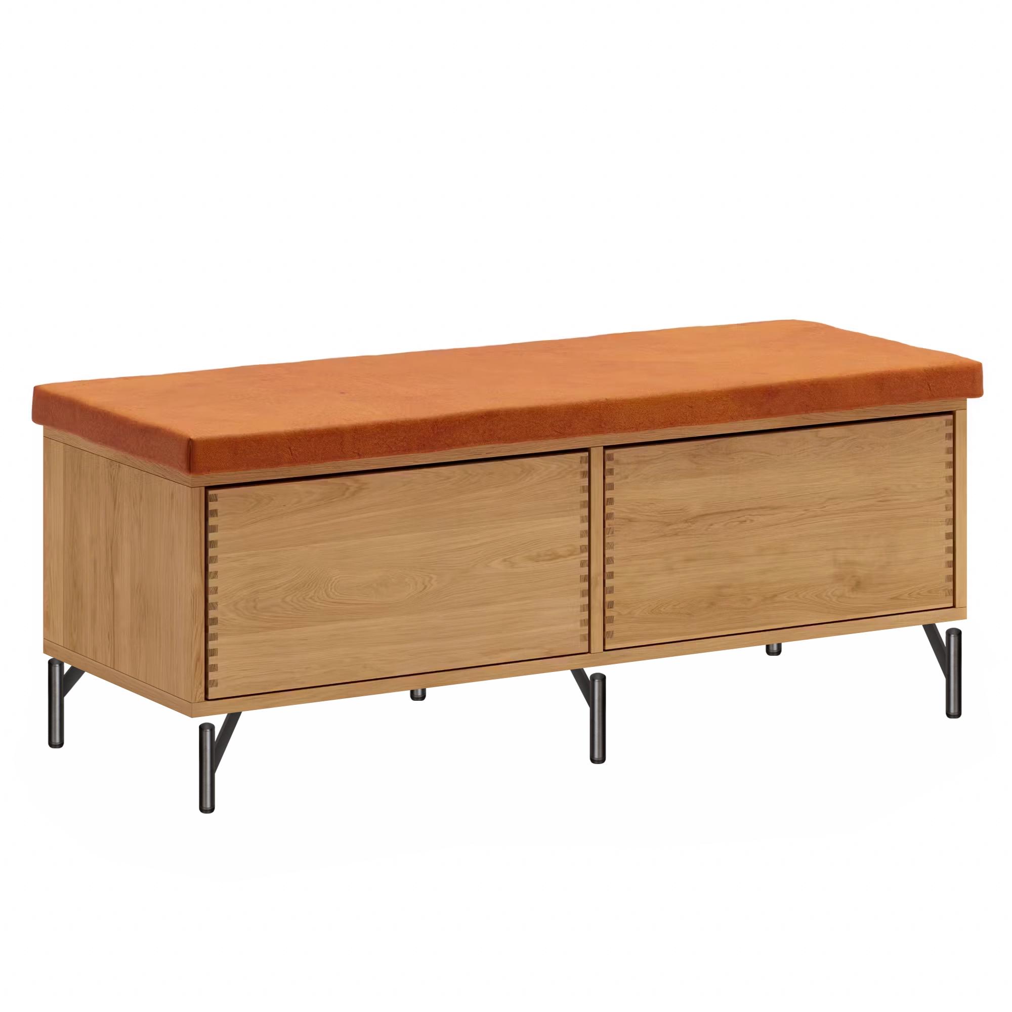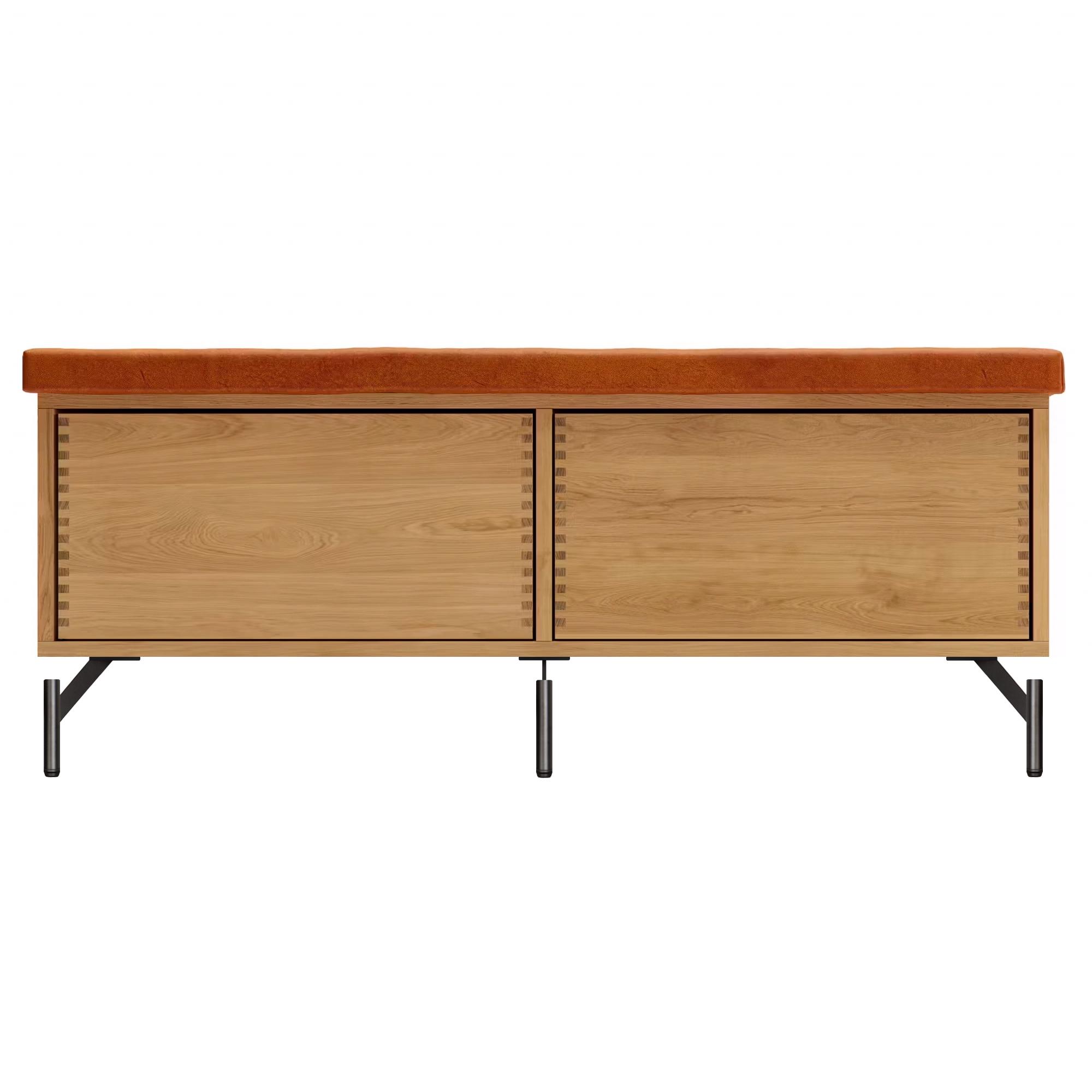 Bænken leveres med gennemgående topplade i fineret egetræ. Den kan bruges både med og uden en hynde (medfølger ikke).