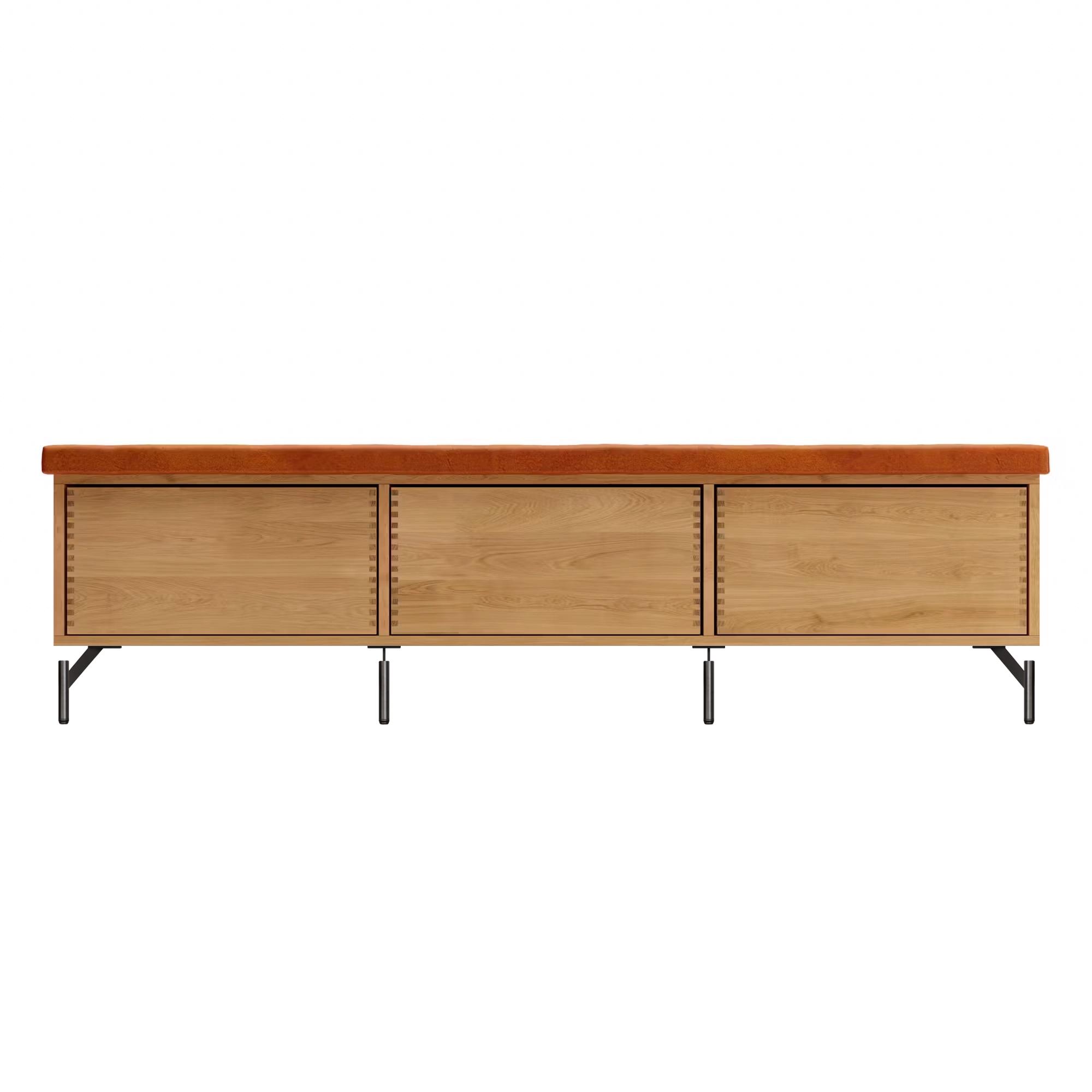 Bænken leveres med gennemgående topplade i fineret egetræ. Den kan bruges både med og uden en hynde (medfølger ikke).
