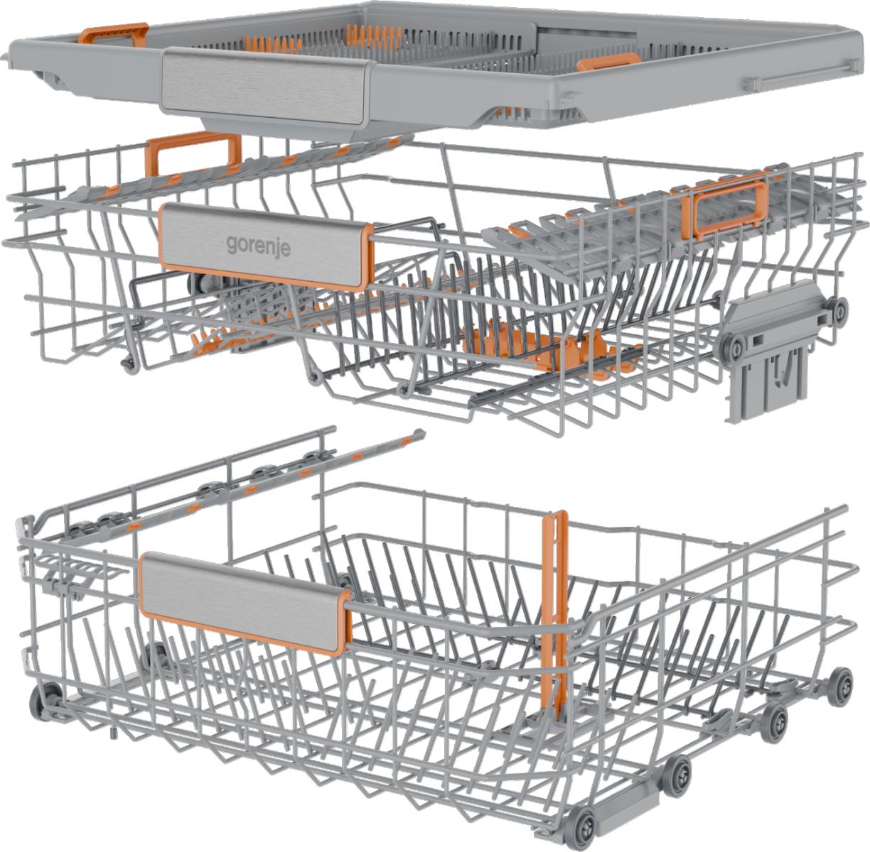 Kurvene har tydeligt markerede, bevægelige elementer og kan tilpasses efter behov. Tallerkenrækkerne kan foldes, og bestik organiseres perfekt i en separat bakke for optimal rengøring og tørring.