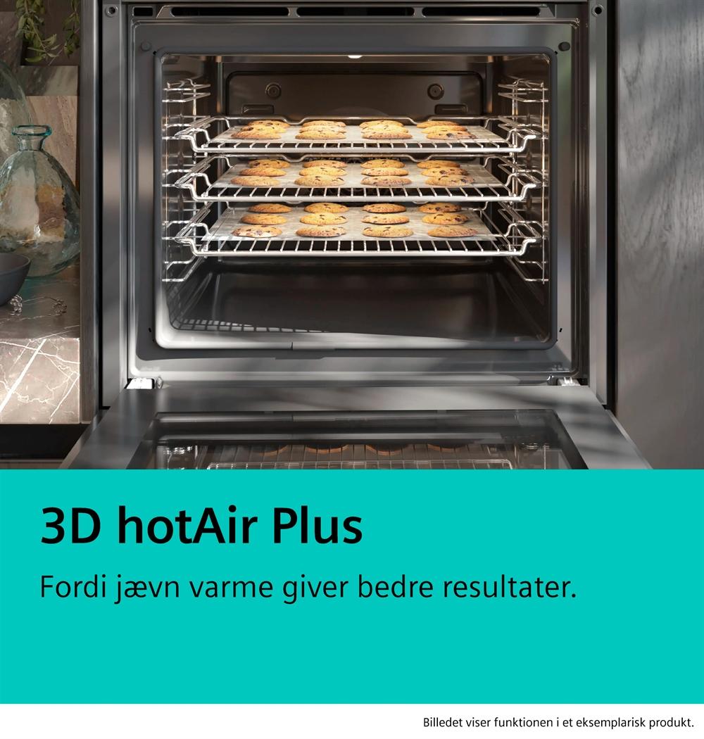 Se frem til perfekte bageresultater hver gang med 3D hotAir Plus. Denne funktion fordeler varmen jævnt i ovnen, uanset om du benytter et, to eller tre af ovnens niveauer, så dit næste bageprojekt udvikler den perfekte konsistens fra top til bund og skorpe til midte. Du kan også give dig i kast med at bage småkager nok til hele julen på alle tre niveauer i ovnen på én gang ⁠— og alligevel forvente perfekte, knasende konsistenser med hvert enkelt bid.