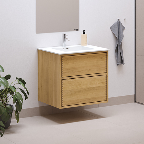 I denne serie har badmøblet en gennemgående glat mellempind i massivt olieret egetræ, som både giver et elegant udtryk og helt lukker af for skuffernes indhold. Skufferne har fuldudtræk og push-to-open. De åbnes med et let tryk på fronten, og lukkes ved at skubbe skuffen tilbage, hvor den glider på plads med et diskret ”klik”.