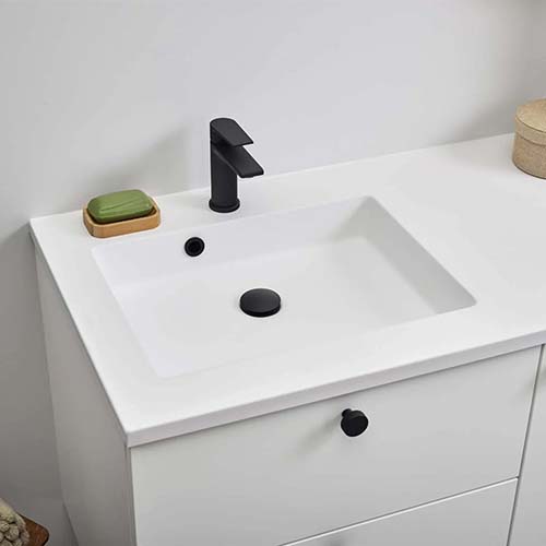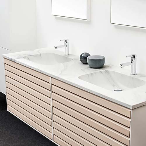 Fremstilles med en speciel stærk gelcoat overflade udviklet til badeværelsesbordplader. Kernen af bordpladen består af en sammensætning af kunststof og naturlige mineraler. Støbt marmor leveres med blank eller silkemat overflade. Rengøres med almindelige husholdningsmidler.