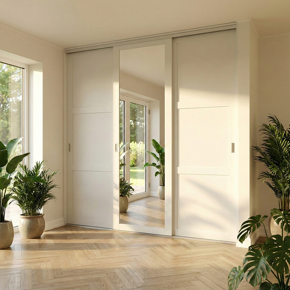 4 skydelåger fra bredde 256 - 307cm. Prisen er inklusiv skinnesæt og beslagskasse.