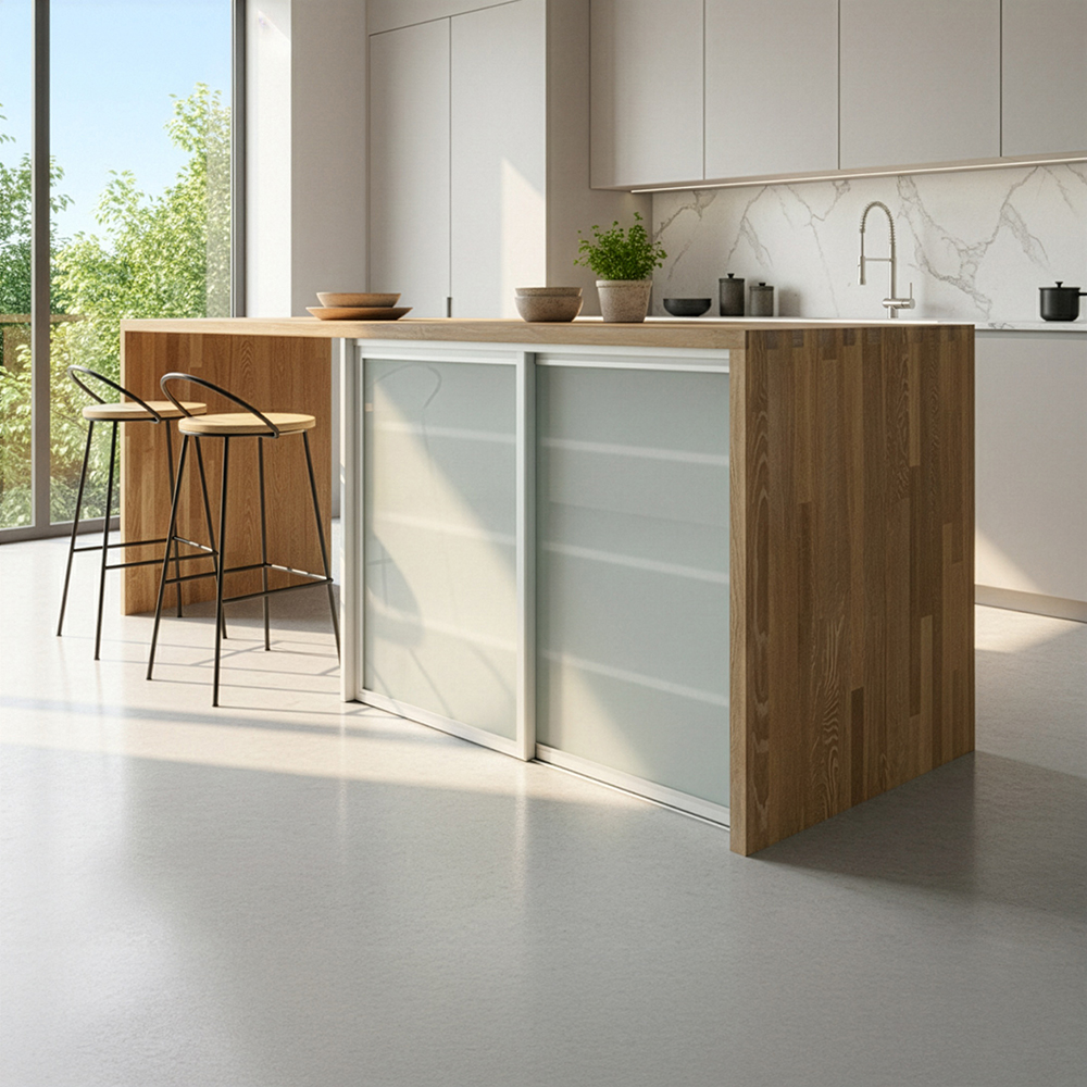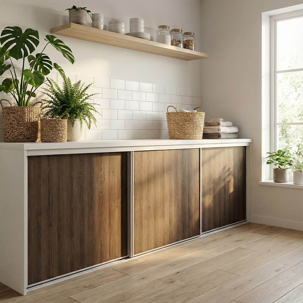 3 skydelåger fra bredde 144 - 192cm. Prisen er inklusiv skinnesæt og beslagskasse.