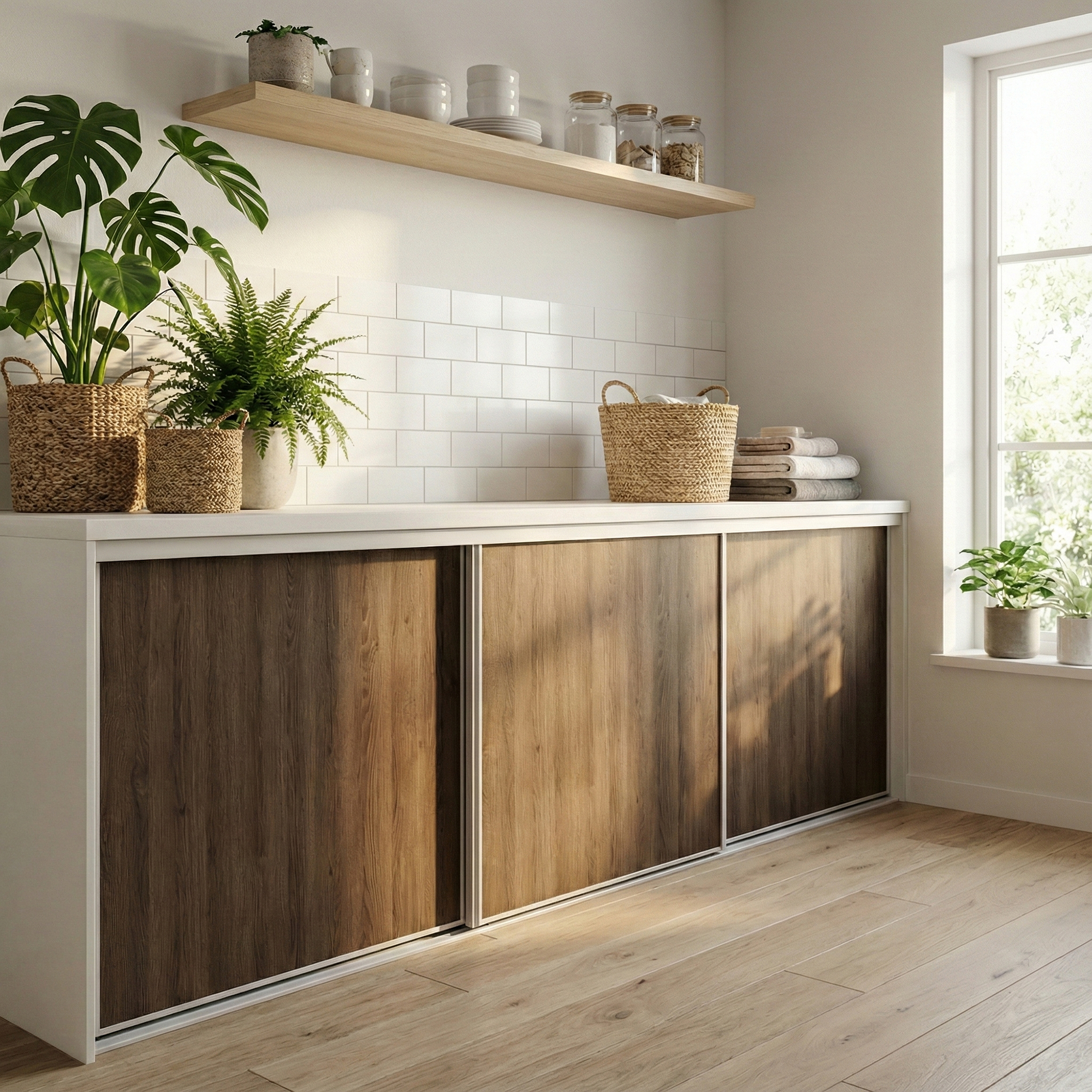 3 skydelåger fra bredde 193 - 231cm. Prisen er inklusiv skinnesæt og beslagskasse.