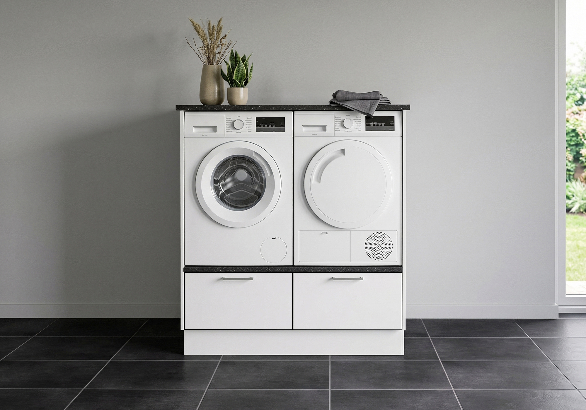 Multi-Living Vask/tør sæt med hvide/sorte linjer | Underskab m. skuffe, Gavle, Sokkelsæt - Bryggers sæt White/Black Linie 24